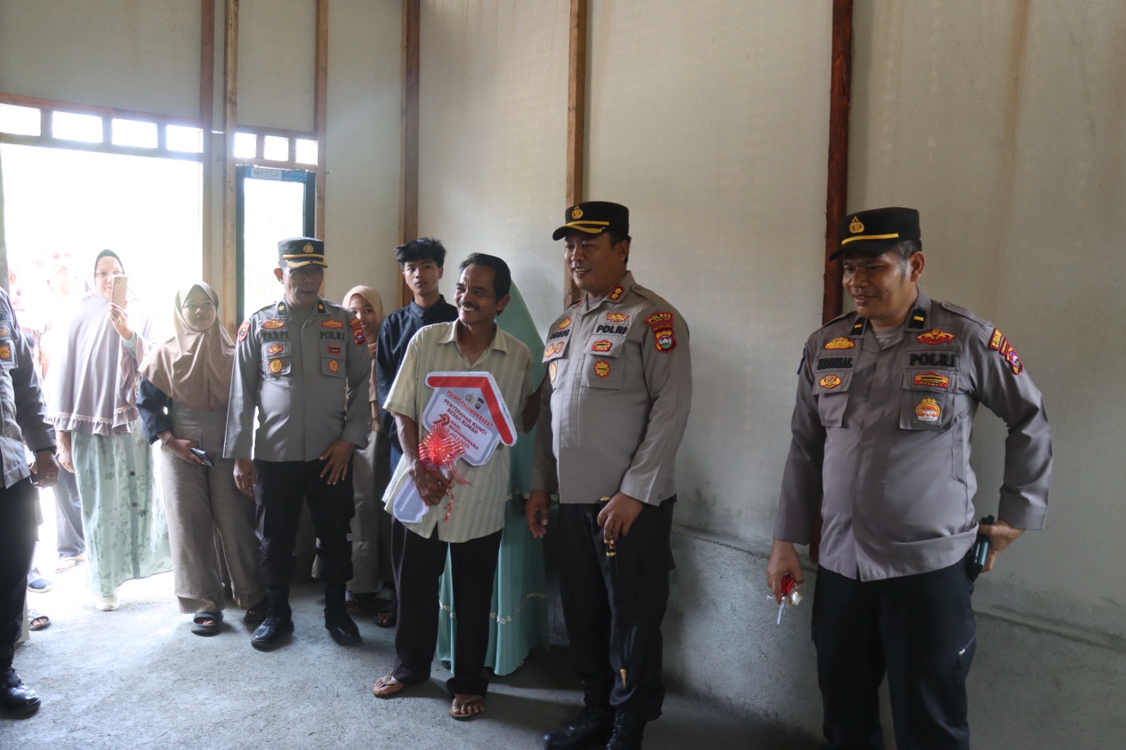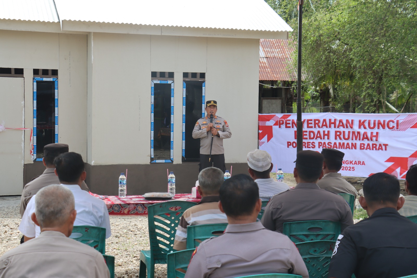 pasamanbarat.sumbar.polri.go.id -- Kapolres Pasaman Barat AKBP Agung Tribawanto, S.Ik menyerahkan kunci kepada penerima bantuan Bedah Rumah Alia Chandra (48) di Lintang Selatan Batang Toman, Nagari Lingkuang Aua, Kecamatan Pasaman pada Rabu (25/6/2025).